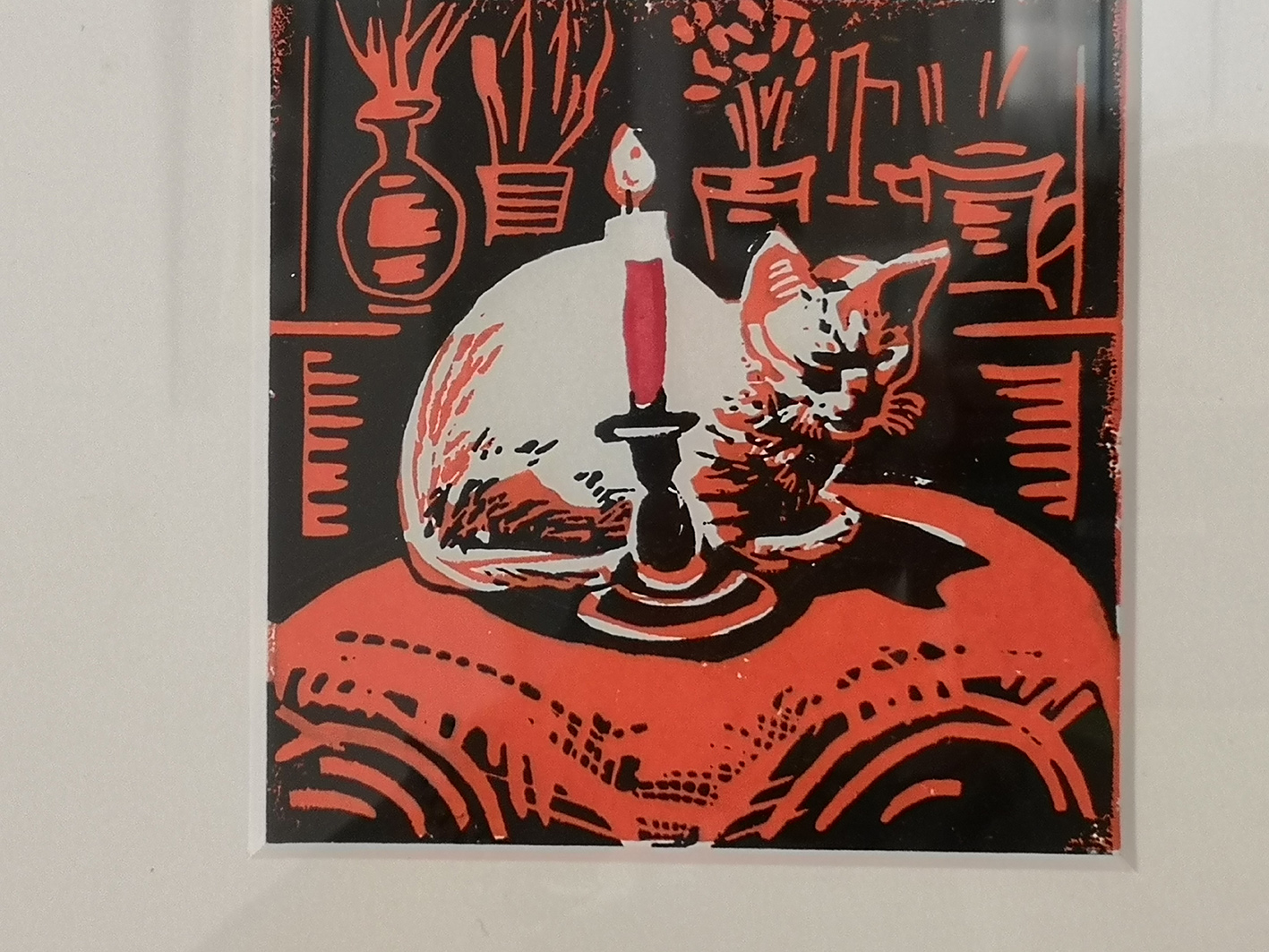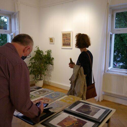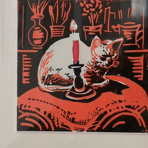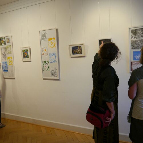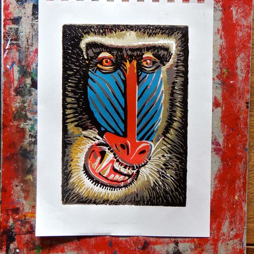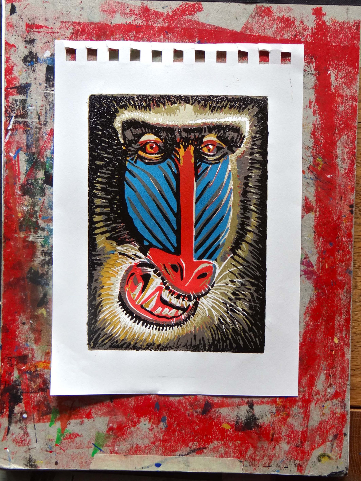 Bei der "Technik der verlorenen Platte" bearbeitet die Künstlerin eine einzige Druckplatte. Sie schnitzt und druckt anschließend eine Farbe, schnitzt weiter und druckt die zweite und so weiter. Bei jedem Arbeitsschritt gehen Details der vorherigen Farben verloren. Am Ende des Prozesses ist die Platte regelrecht weggeschnitzt, eben "verloren". In ihrer Ausstellung "Aug in Aug – Tierporträts im Mehrfarben-Hochdruck" finden Besuchende Drucke beider Techniken.