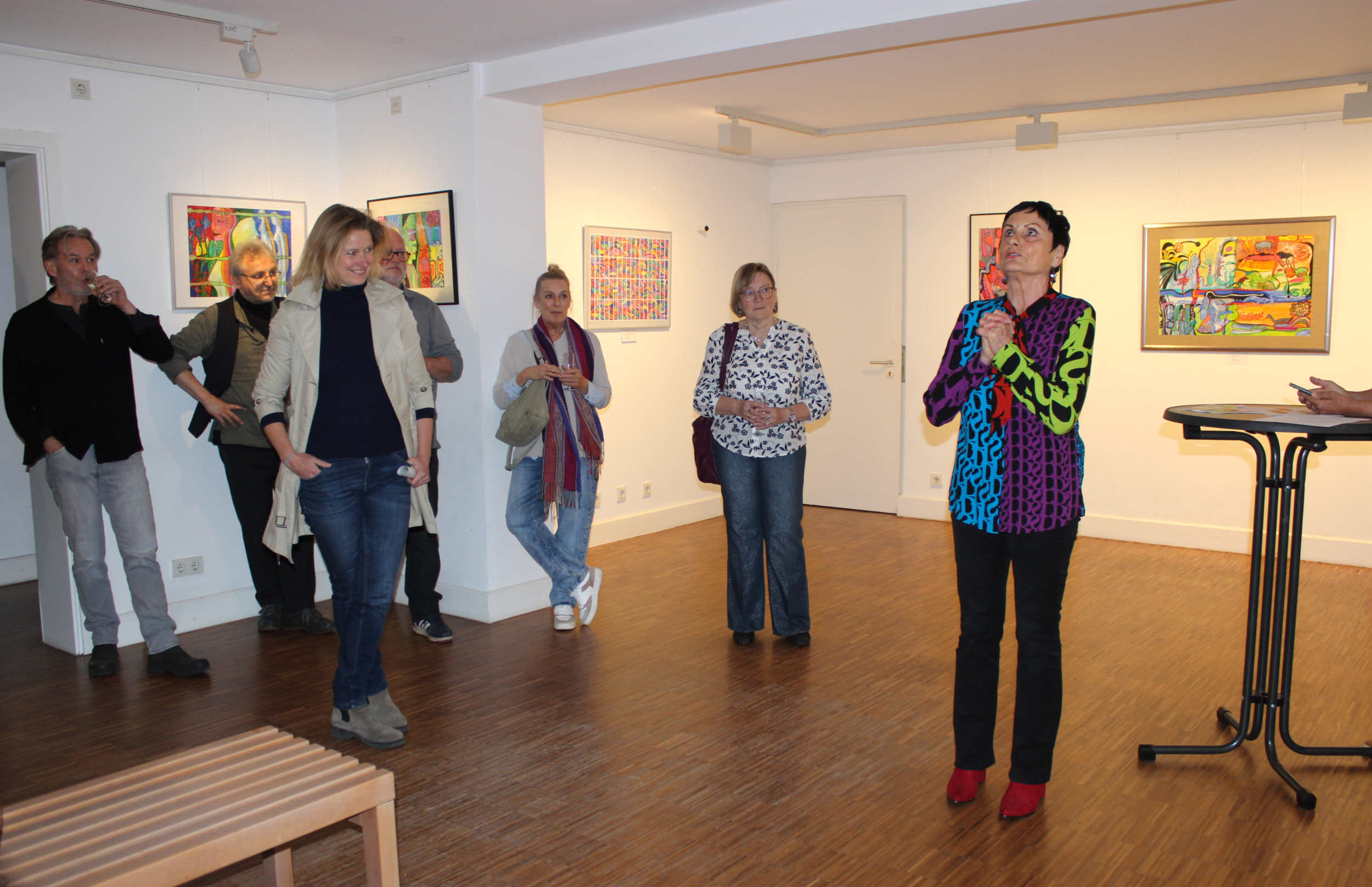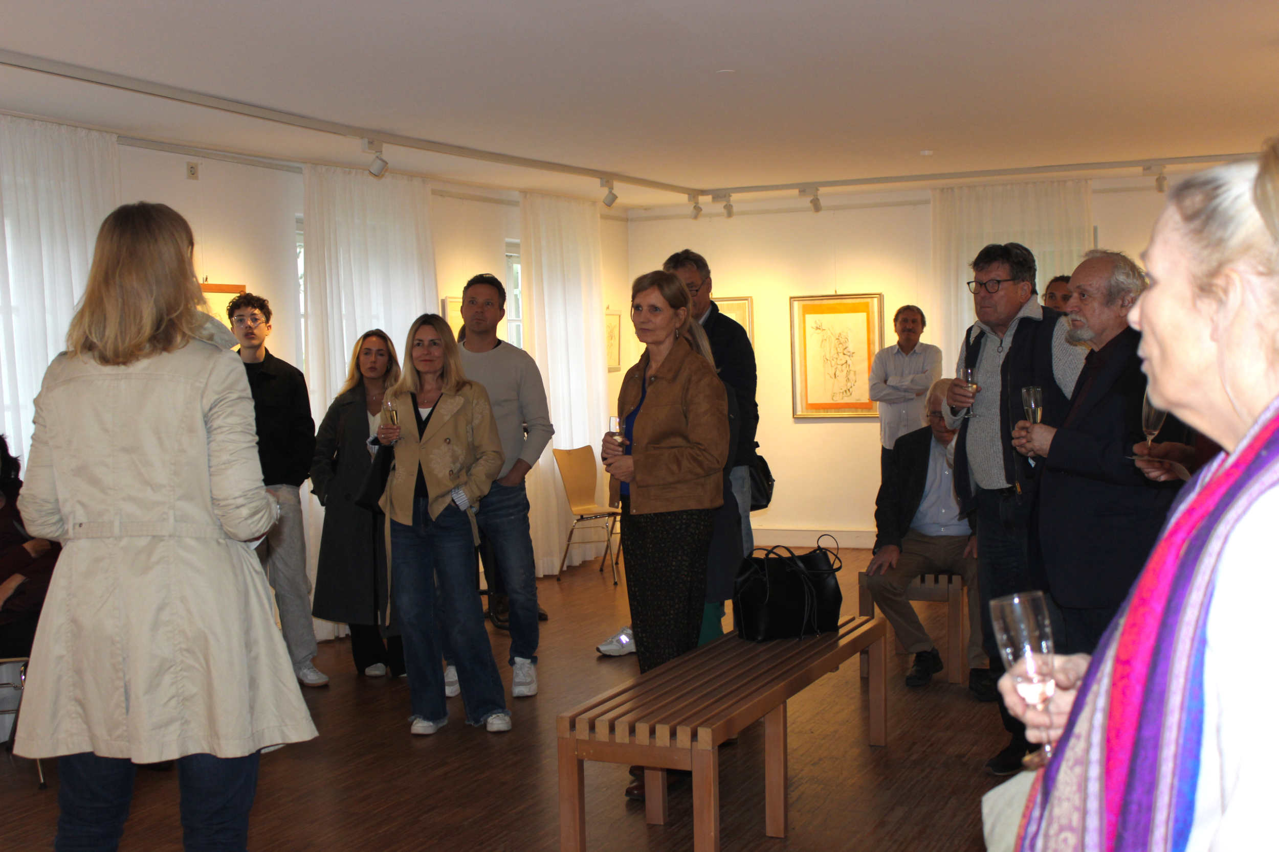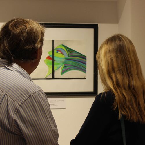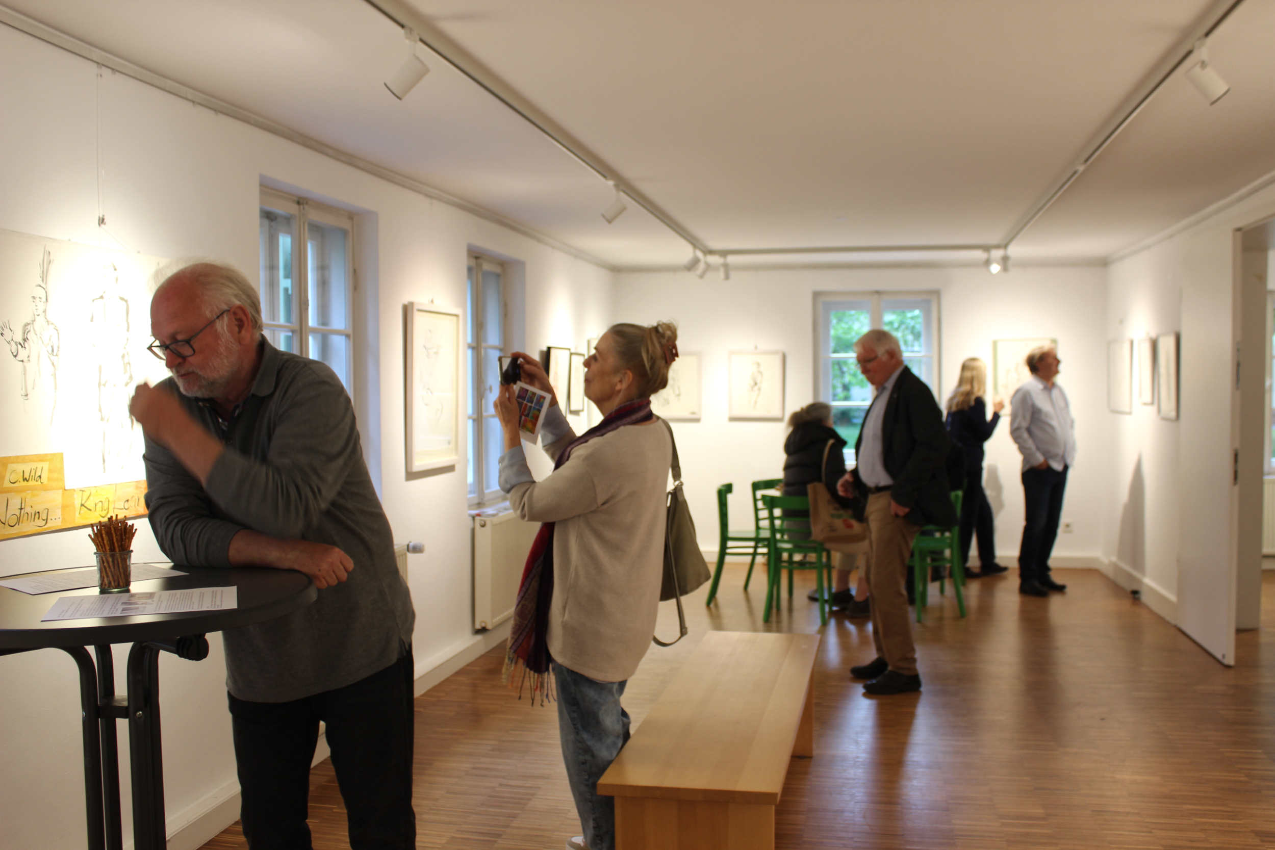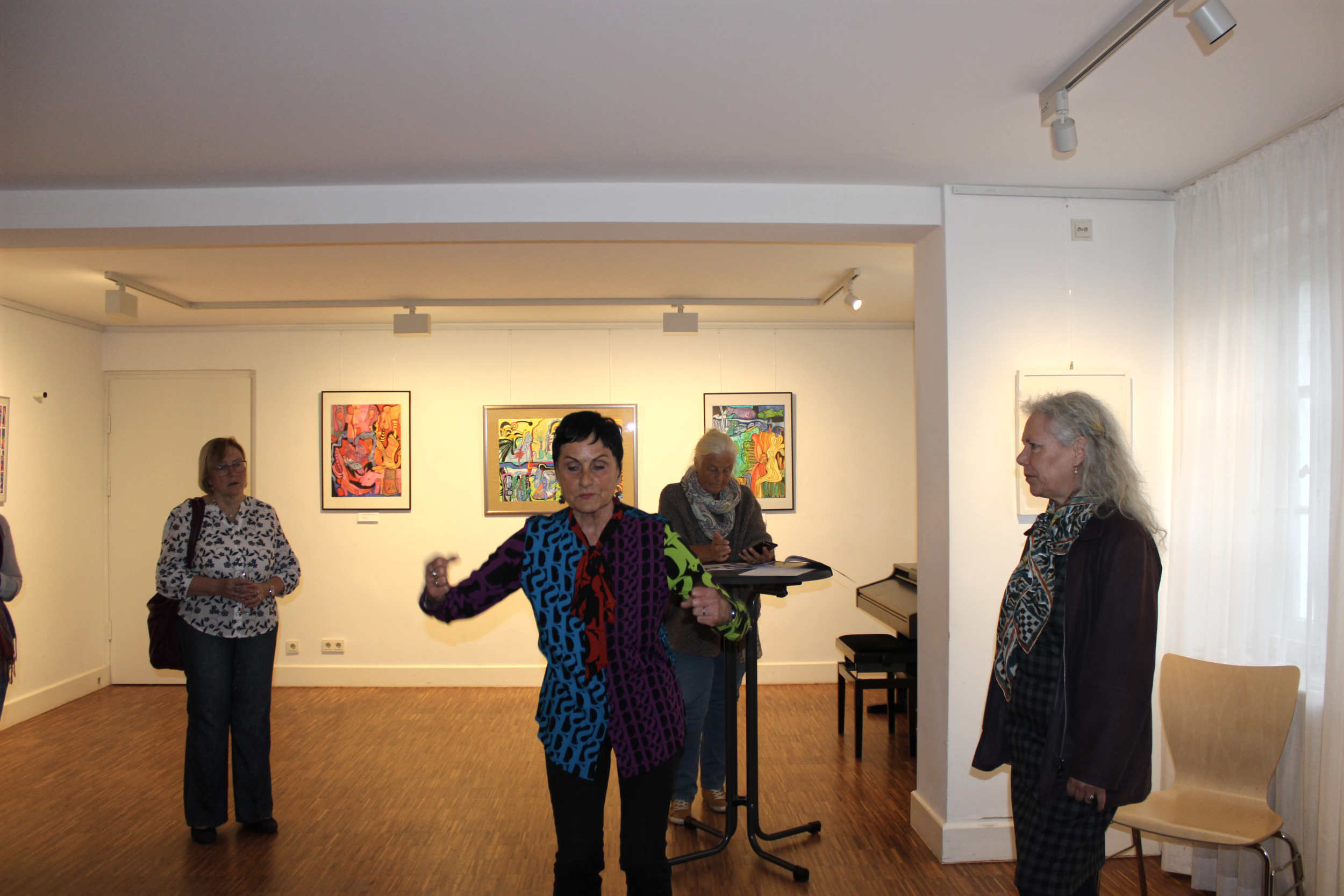 Die Ausstellung umfasst große Collagenformate mit farbigen Köpfen, Figuren und Eindrücken sowie einen variierenden Pinselduktus, der sich mit schwarzer Tusche in hauchdünnen Pinselstrichen aber auch in wilden und ungezähmten Federstrichen zeigt.