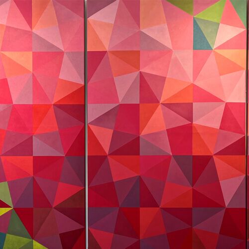 In ihren Werken werden Gesellschafts- und Umweltfragen in geometrischen Formen, Linien und Flächen behandelt. Die Farben sind kräftig und präsent.
