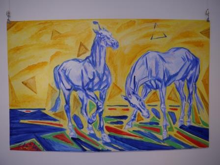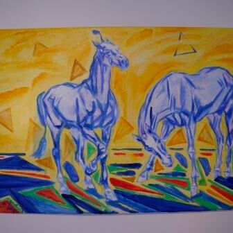 Pferde spielen für die Geschichte und die Kultur der Mongolei eine sehr große Rolle. Sie werden oft als Symbol für Stärke genutzt und sogar als „Himmelswesen“ bezeichnet. In Kombination mit Blau, das in der Symbolik für Weisheit steht, überbringt der Künstler mit seinen Werken eine eigene Botschaft in den Westen.