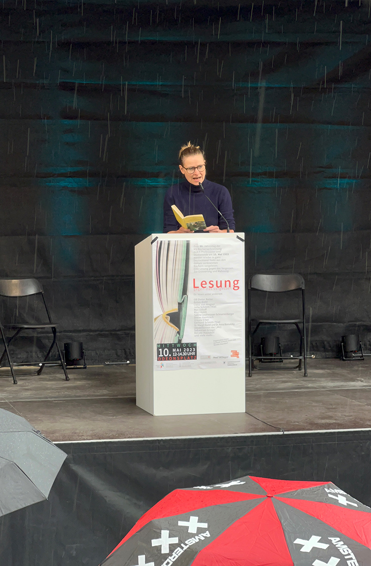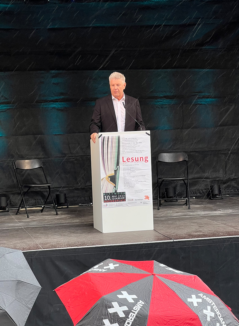 Am Mittwoch, den 10. Mai 2023 erinnern ab 12 Uhr Lesungen einst verbrannter Texte an die von den Nationalsozialist:innen verfemten Autor:innen. Im letzten Jahr konnten Zuhörer:innen unter anderen die Stimmen von Dieter Reiter, Max Uthoff, Claus von Wagner, Sabine Leutheusser-Schnarrenberger, Anton Biebl hören.
