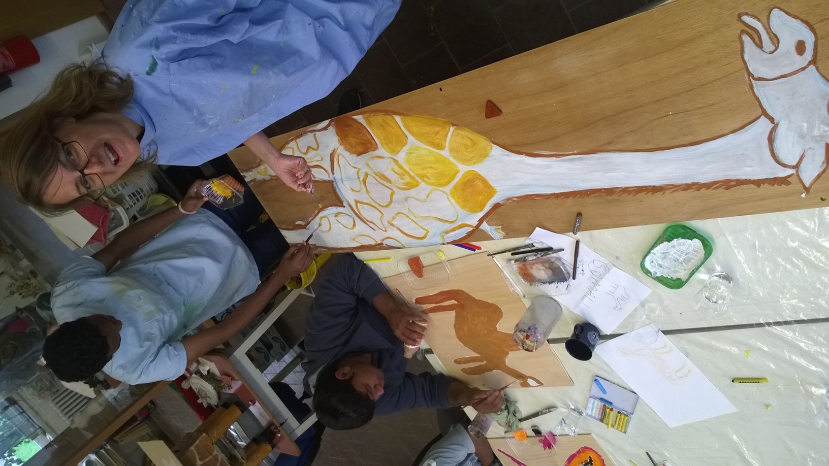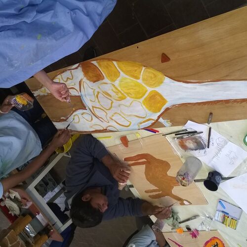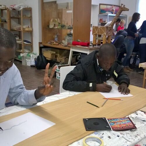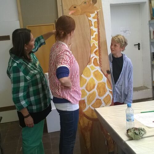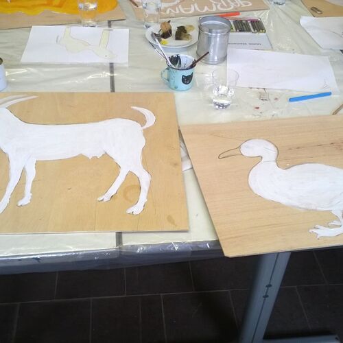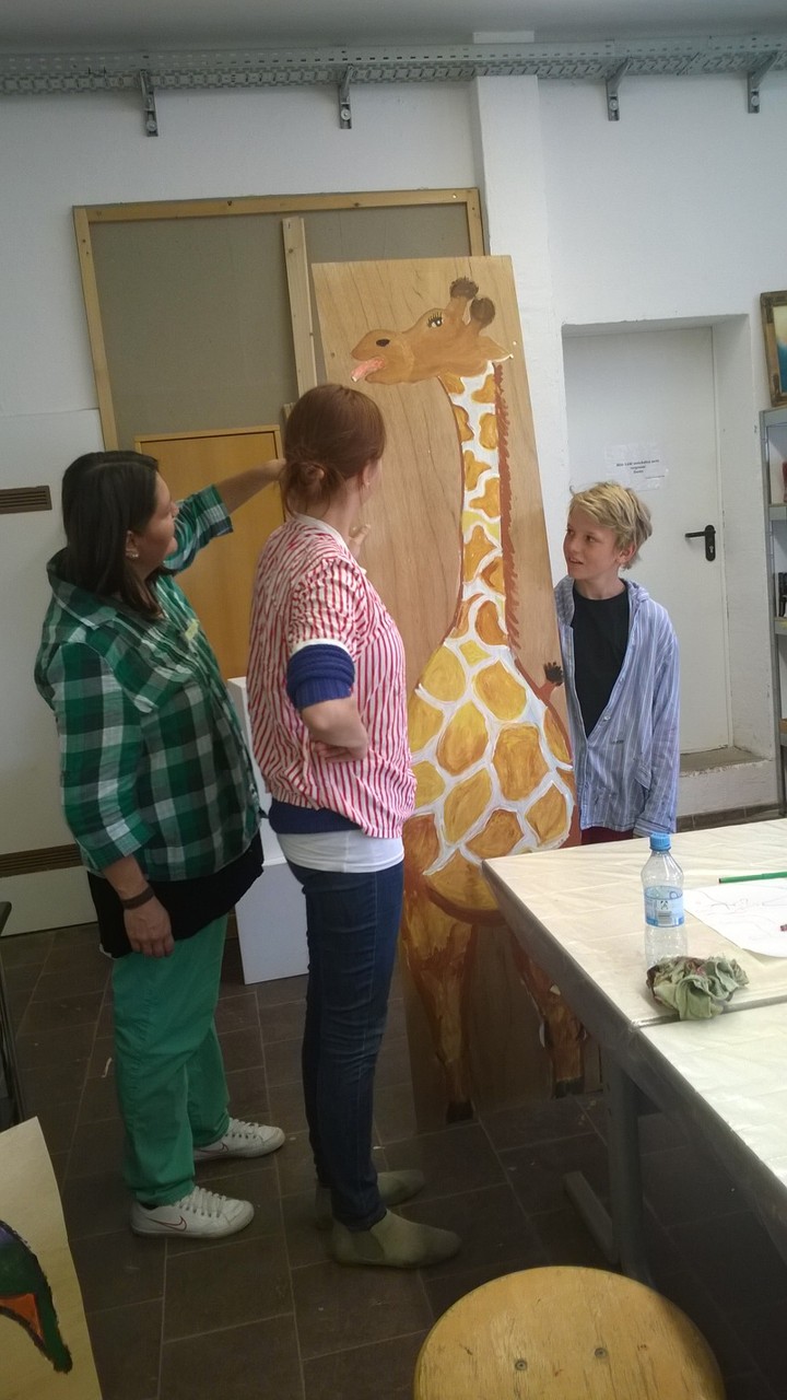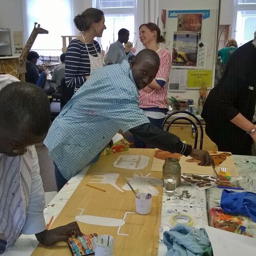 Ein paar Helfende haben sich vorgenommen, für die Kinder eine freundliche Spielecke in der großen Ankunftshalle herzurichten. Aus Holz wurden Tiere gebastelt und bemalt und dann in der Spielecke aufgehängt. Ein Projekt der Mohr-Villa Kunstwerkstatt in Kooperation mit Diakonia und Flüchtlingshilfe München e.V.