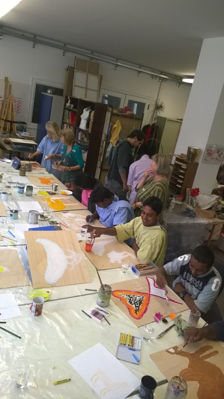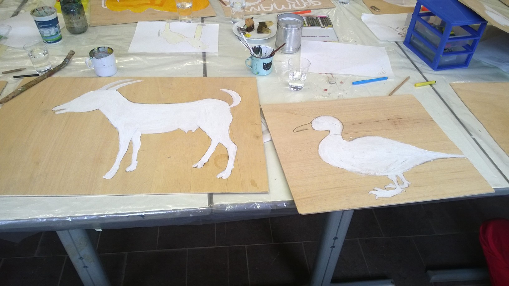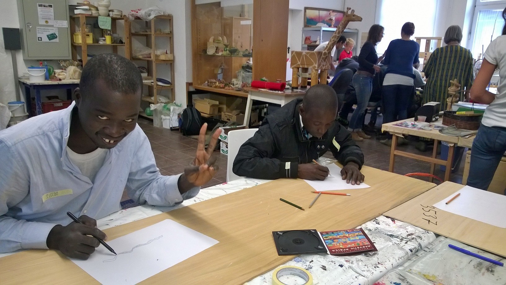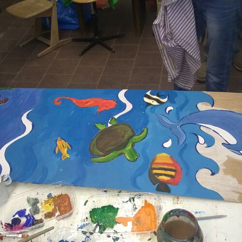 Ein paar Helfende haben sich vorgenommen, für die Kinder eine freundliche Spielecke in der großen Ankunftshalle herzurichten. Aus Holz wurden Tiere gebastelt und bemalt und dann in der Spielecke aufgehängt. Ein Projekt der Mohr-Villa Kunstwerkstatt in Kooperation mit Diakonia und Flüchtlingshilfe München e.V.