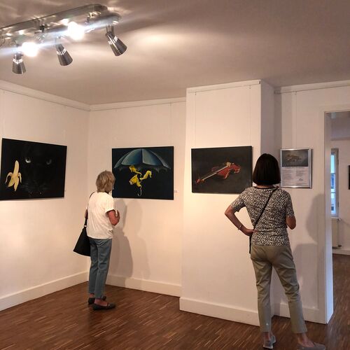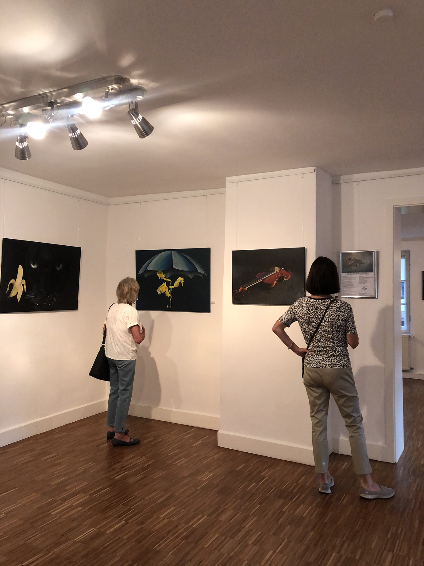 Tiere: Der Künstler Frank Meier ist Tierliebhaber und malt vornehmlich Tiere in unterschiedlichsten Facetten in Acryl auf Leinwand. Er erzählt von Tieren, die sich irgendwie merkwürdig benehmen. Ein Elefant spielt Schach, eine Katze wickelt ein Wollknäuel aus Schlangenhaut auf, ein Kalb wird von Störchen gehütet, ein Eisbär schwimmt mit einem Maulschlüssel im Maul durch einen Schwarm Fische, etc. Eines aber haben alle Motive gemeinsam: die Darstellung der Tierwesen ist wirklichkeitsgetreu. Sie sind nicht abstrakt dargestellt, sondern realistisch, das führt uns zum Realismus: