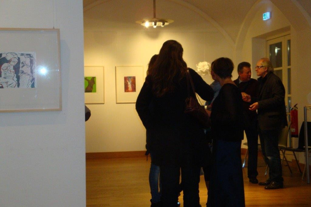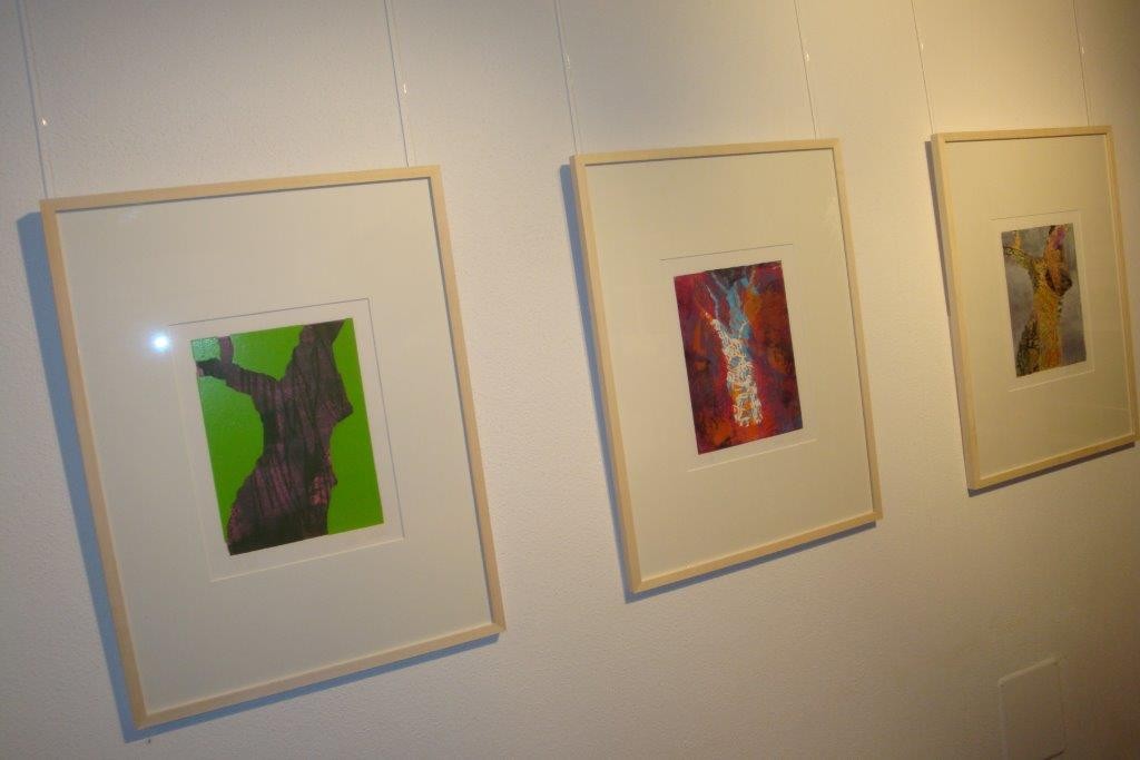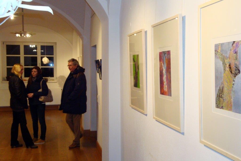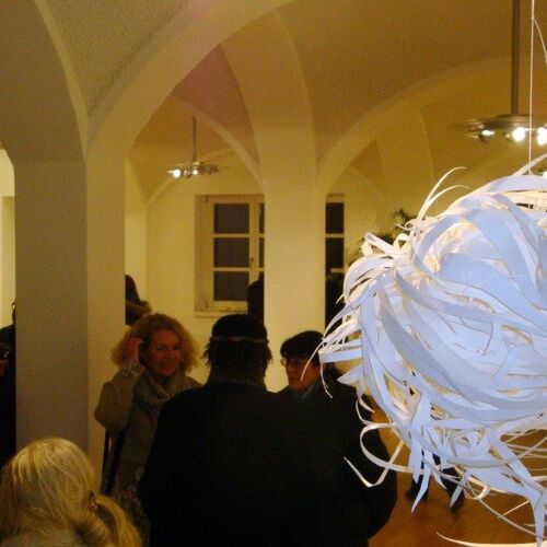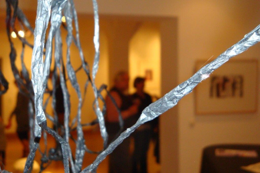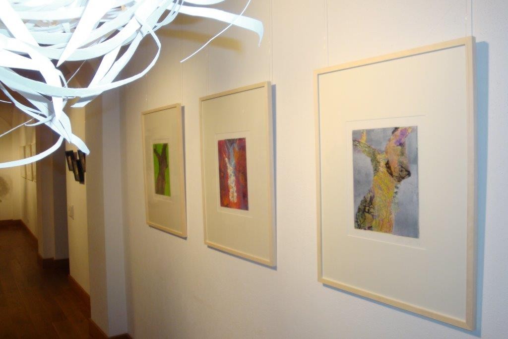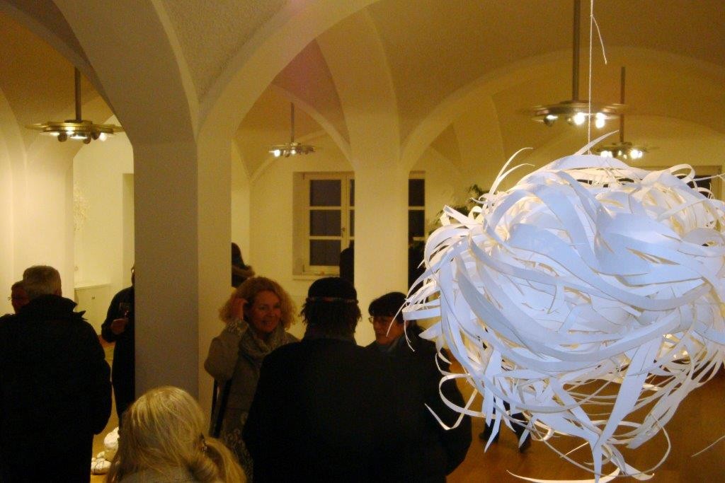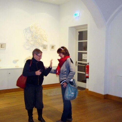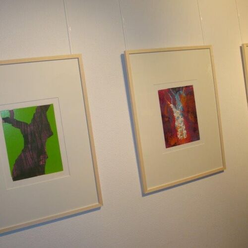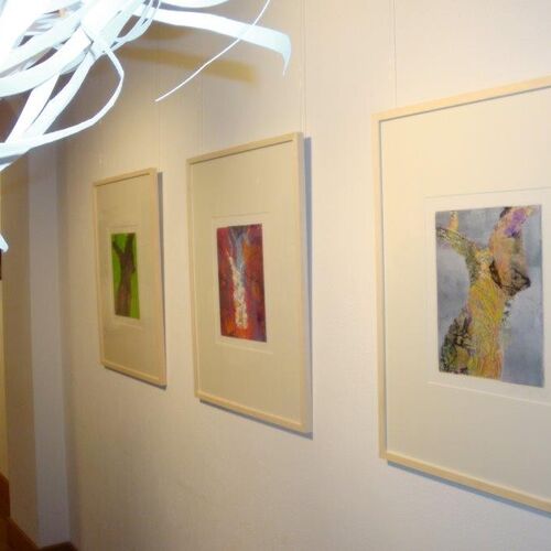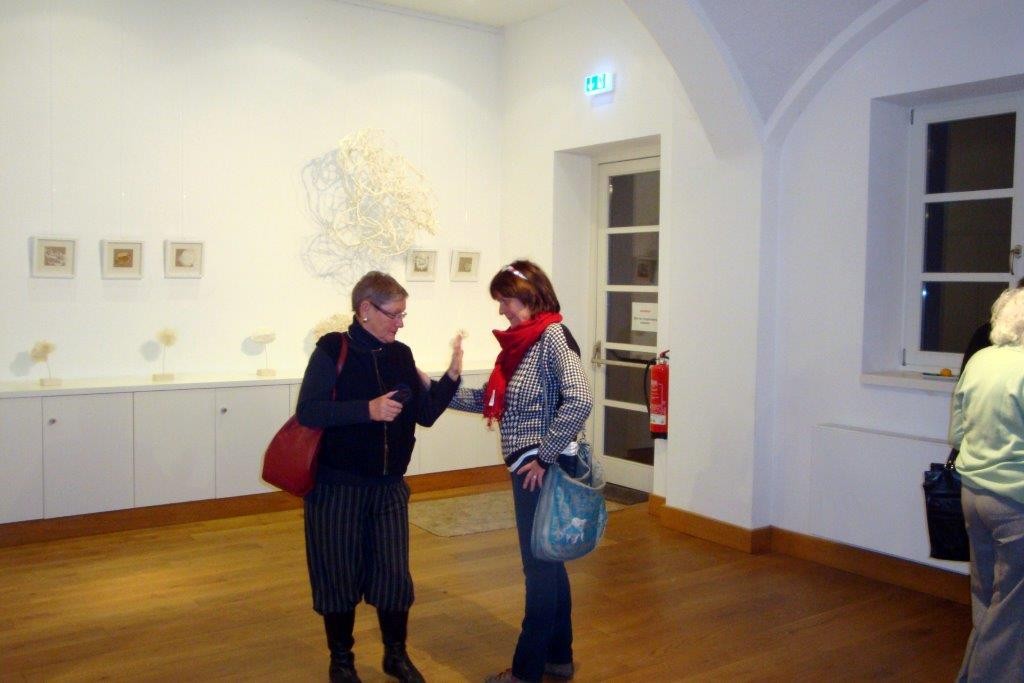 Gisela Birkenthal (Holzschnitt) und Barbara Kleiber-Wurm (Papierobjekte) spielen, formen, zeichnen, schnitzen und drucken mit diesen Begriffen.