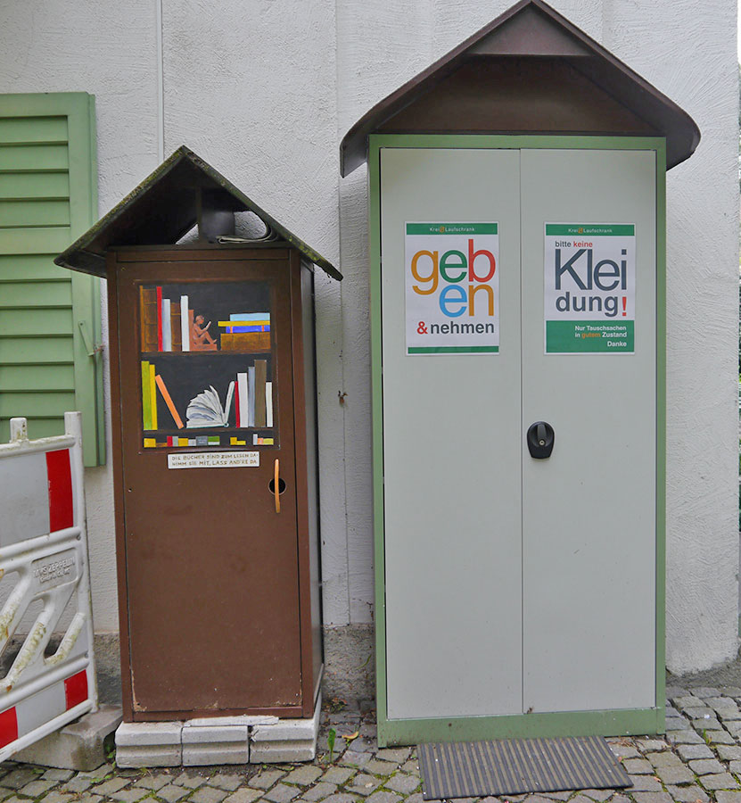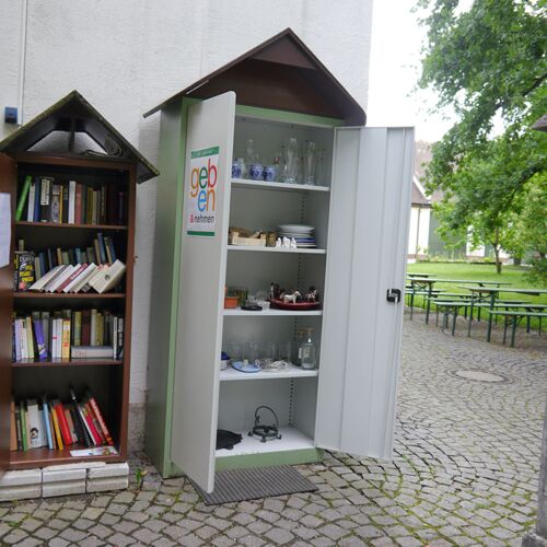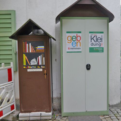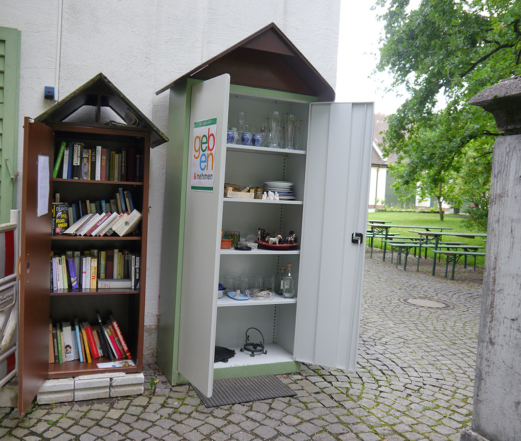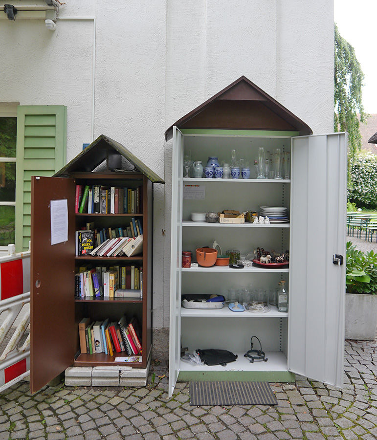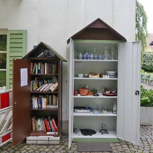 Ein Schrank für tauschbare Gegenstände. Hier können gut erhaltene und brauchbare Dinge neues Leben finden: Ob Haushaltsgegenstände, Spielzeug oder Ähnliches… dem „Tausch-Spaß“ sind keine Grenzen gesetzt.