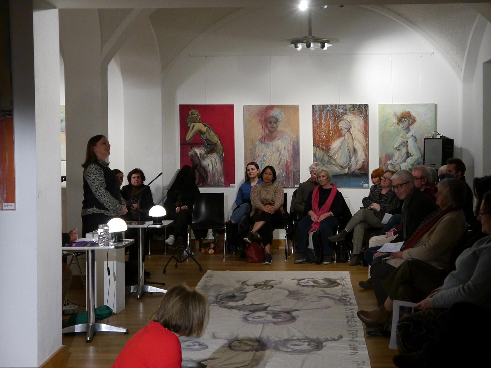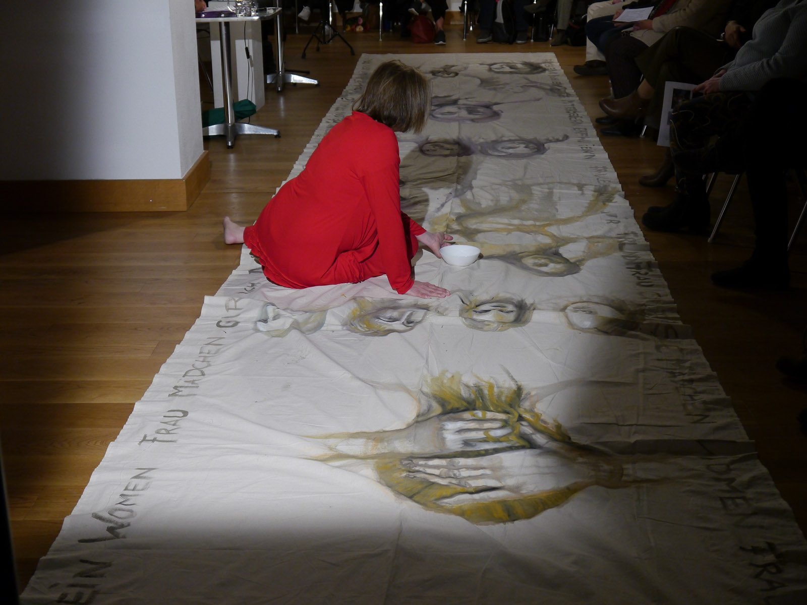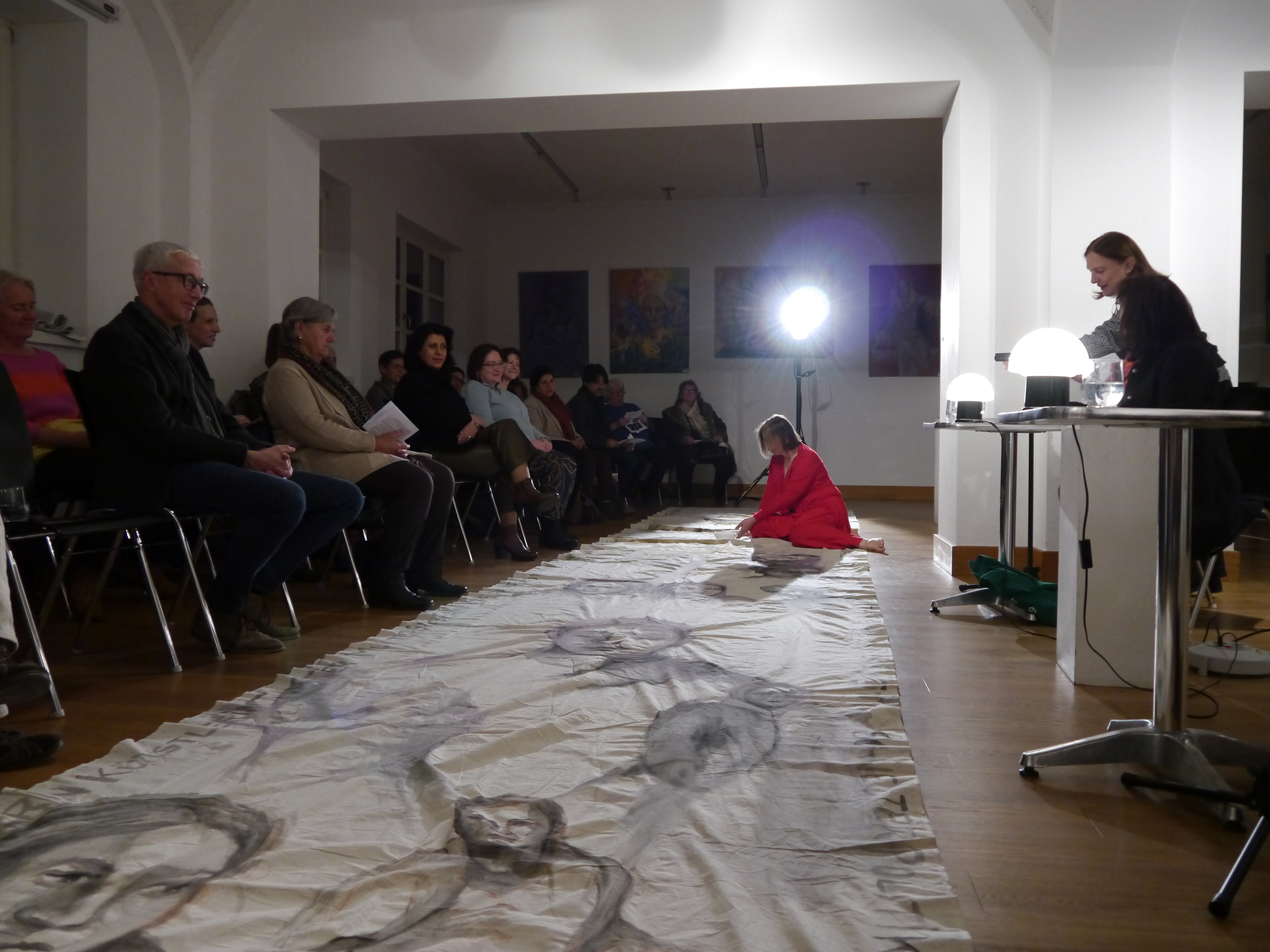 Eine Performance vor der Rauminstallation „Tafelbilder – Frauen, in Stoff verwickelte Wesen“ mit der Butoh-Tänzerin Urte Gudian beschließt den Abend.