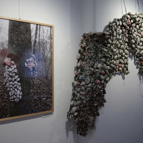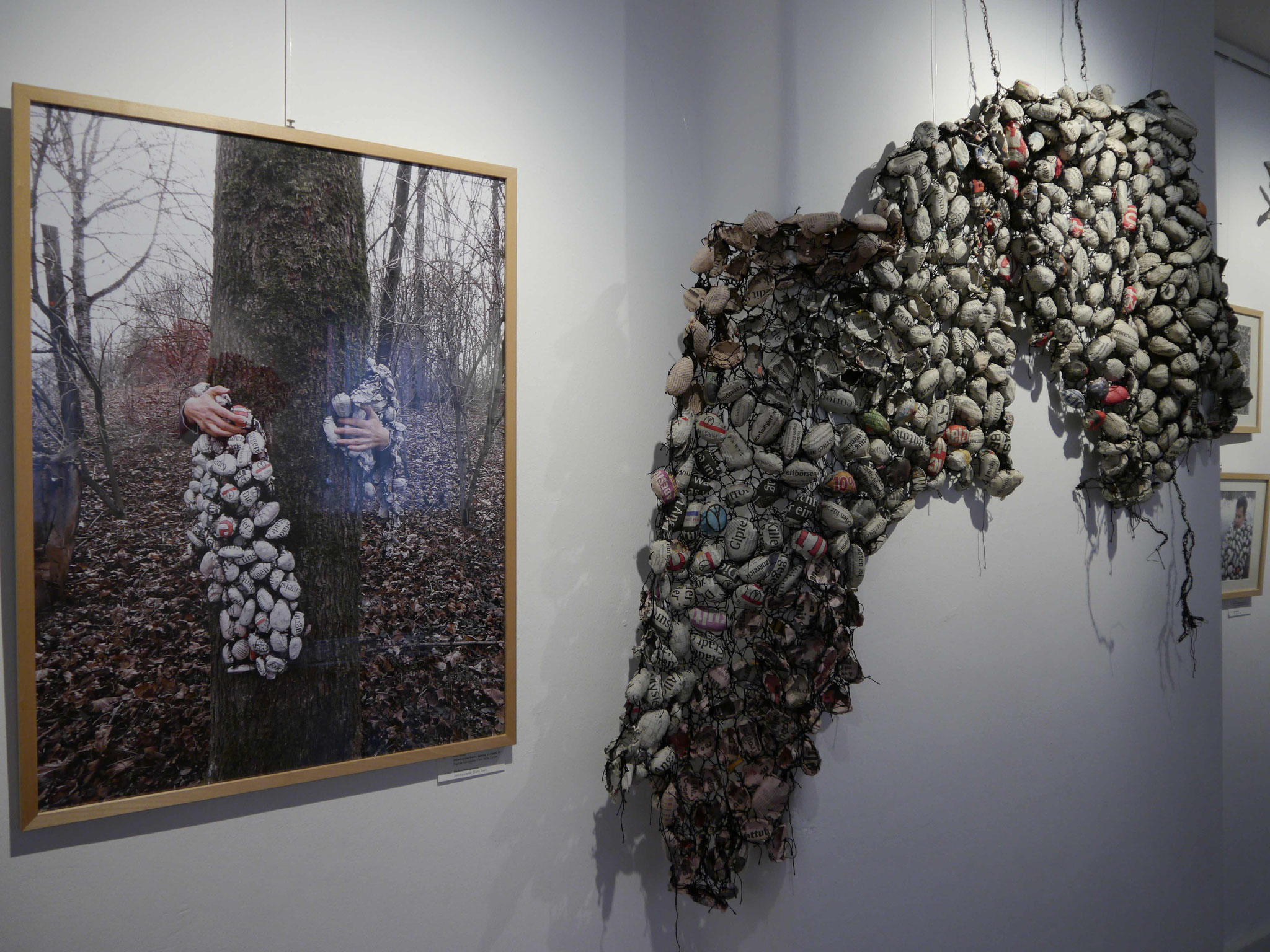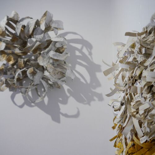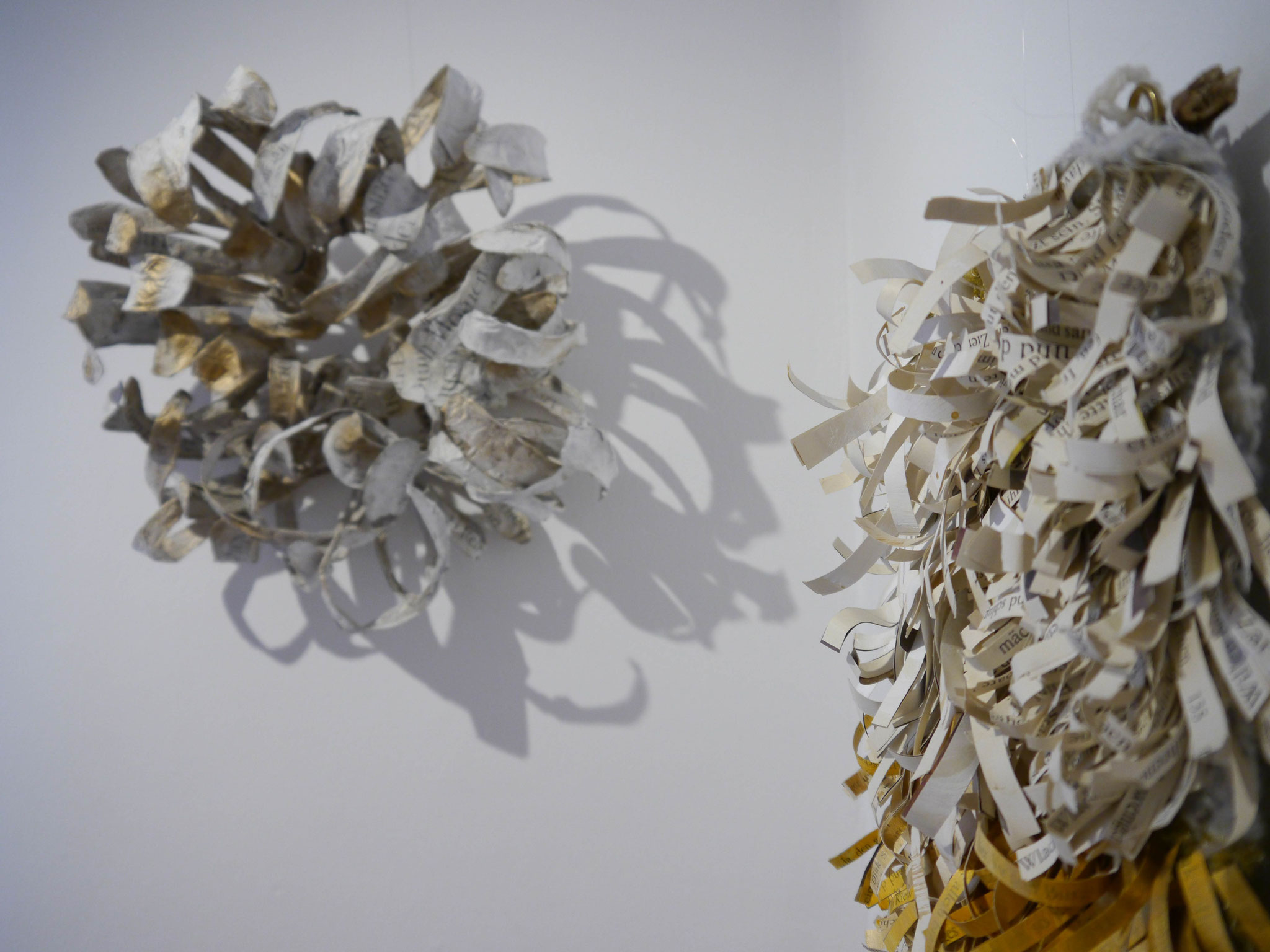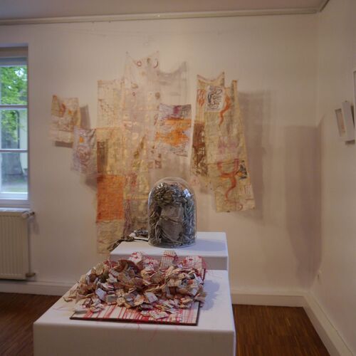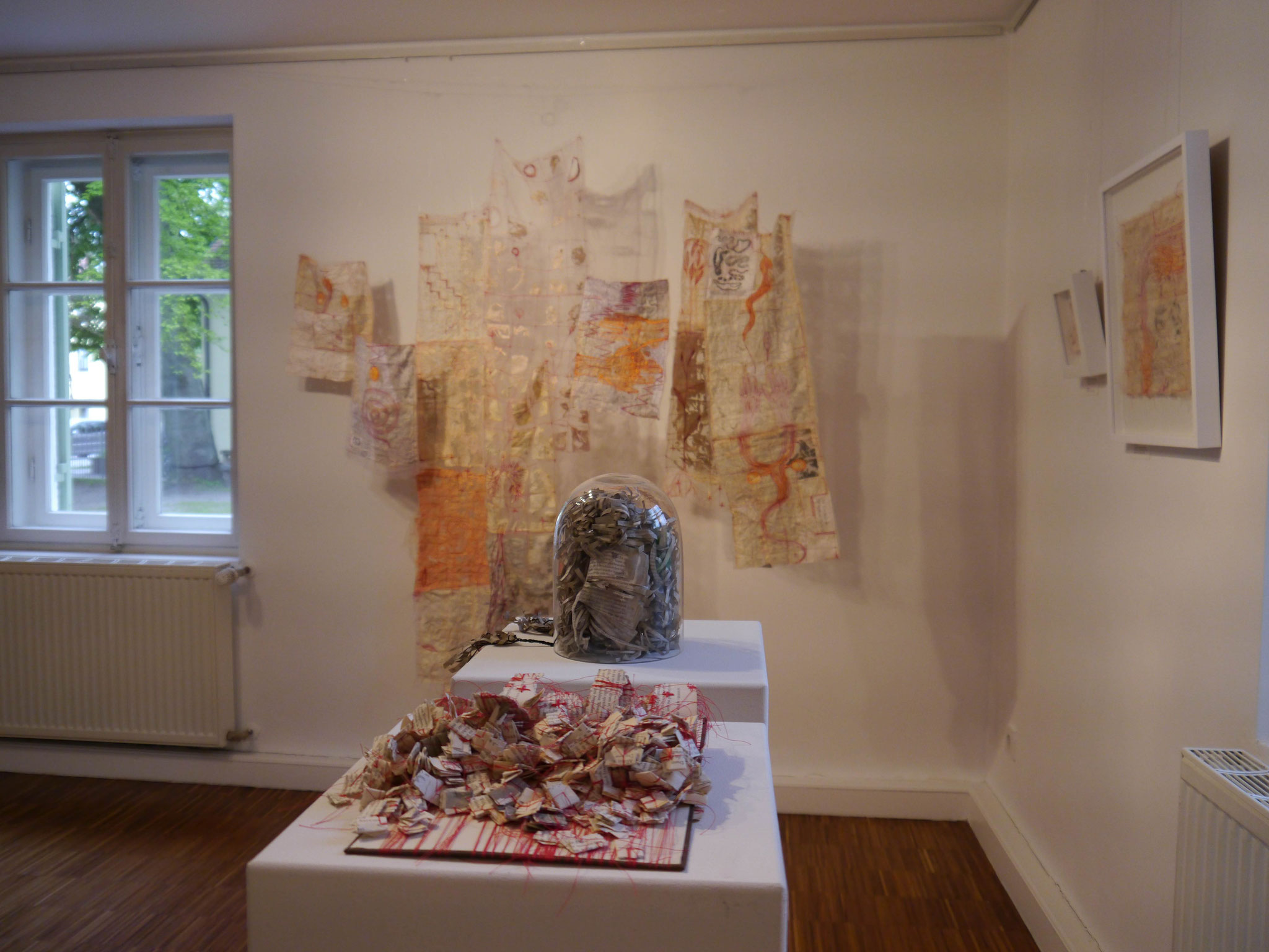 Ines Seidel verändert Papier, das bereits ein Leben hinter sich hat – als Buch oder Zeitung. Die Papierkünstlerin verformt die bedruckten Seiten, arbeitet mit Garn, Draht und Wasser, und belebt sie als Buchobjekte, Wandgewebe und auf Fotos wieder. Auch Tusche und Wachs kommen bei den Transformationen des Kulturabfalls zum Einsatz. Die entstandenen Muster und Strukturen geben Texten einen Körper und machen sie berührbar.