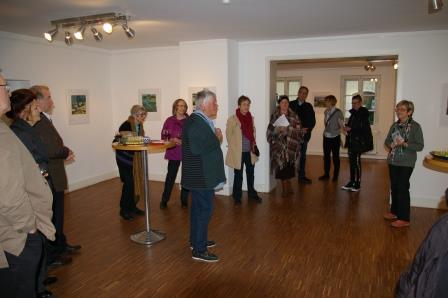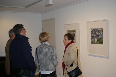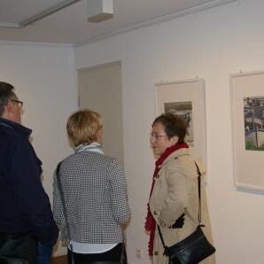Malerei und Grafik ziehen sich wie ein Faden durch die Ausstellung. Die kleinformatigen Bilder sind auf Papier mit Acrylfarben gemalt. Die Druckgrafik zeigt Intagliotypien, ein Tiefdruckverfahren ähnlich der Radierung. Die Herstellung der Druck platten ist sehr umweltschonend. Die Auswahl der Druckmotive ist vielfältig. Monika Arndt bevorzugt eigene Fotos oder Zeichnungen als inhaltliche Vorlagen.