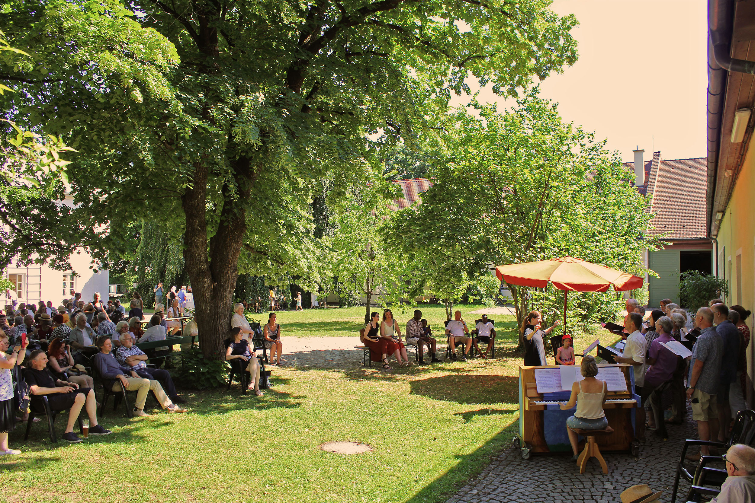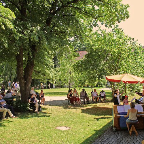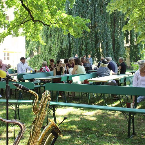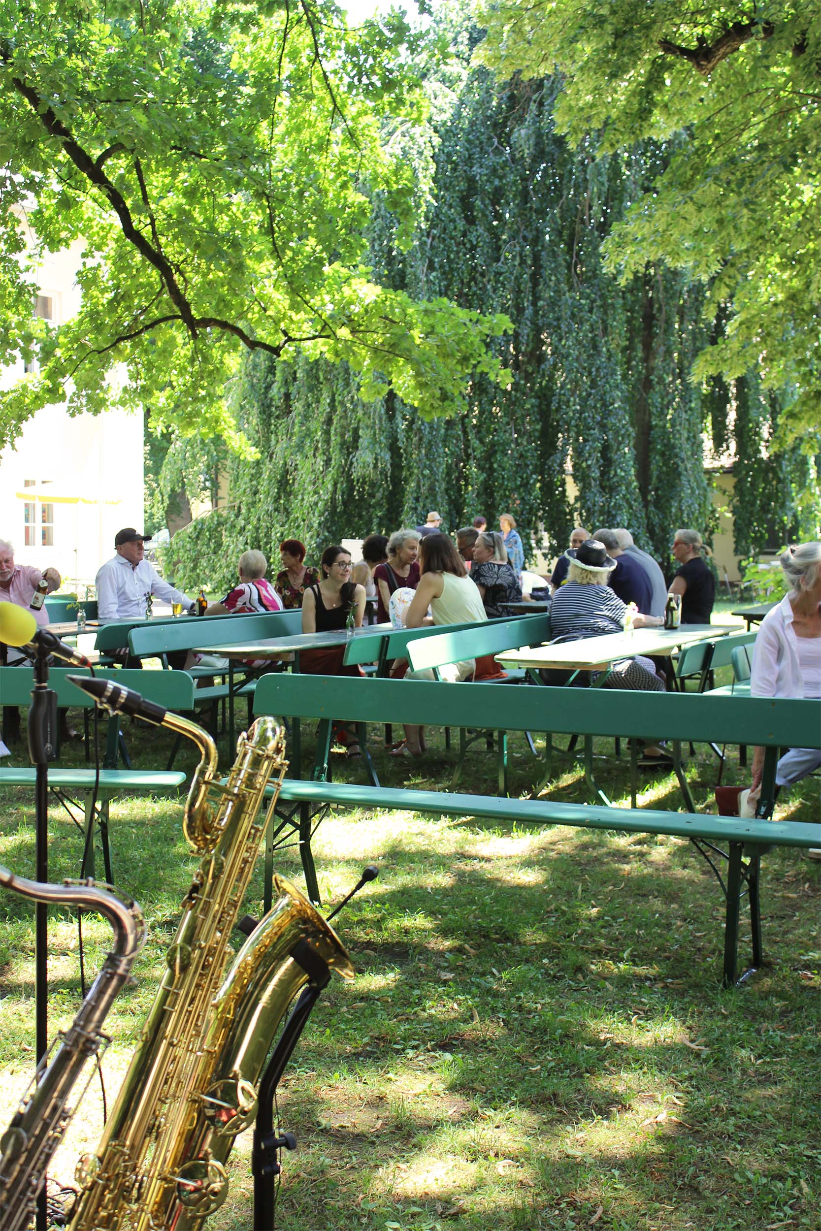 Und die Münchner Jazz Band Sometimes Six serviert einen süffigen Cocktail aus Swing, Bossa, Bebop und Funk. Mit dem beliebten Repertoire aus dem American Songbook der 40-er und 50-er Jahre bringen sie eine gelassene Stimmung unter Bäumen.