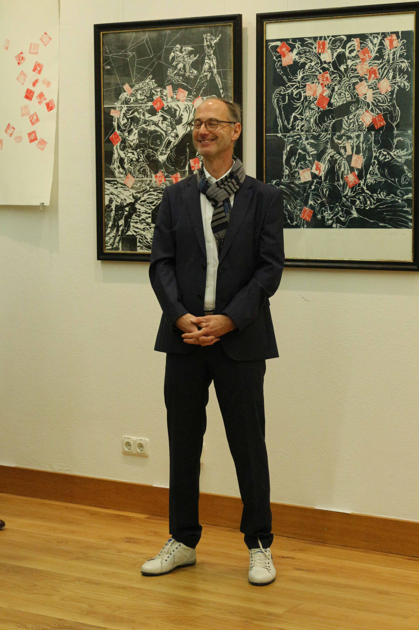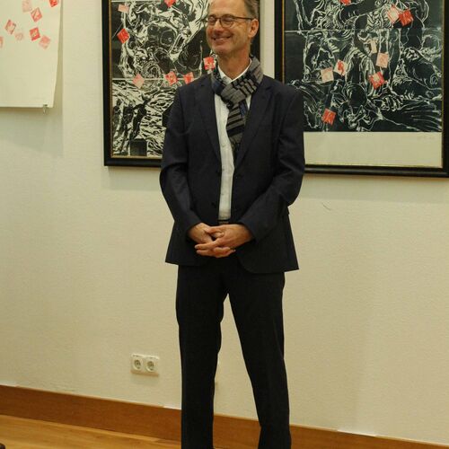 Der Künstler zeigt einen Ausschnitt seiner druckgraphischen Arbeit in der Mohr-Villa. Zu sehen sind überwiegend Holzschnitte in Schwarz-Weiß-Technik, wie auch unter Einsatz von Farbe, einige in Kombination mit Radierung.